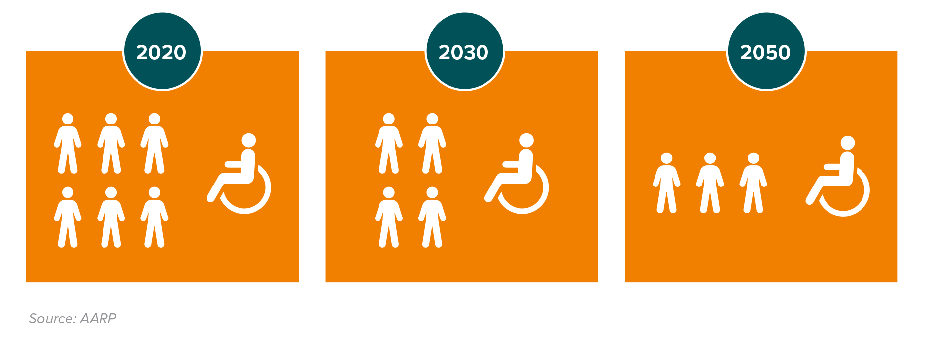 By 2030, there will be 34% fewer professional caregivers available per senior and by 2050, 50% fewer caregivers.