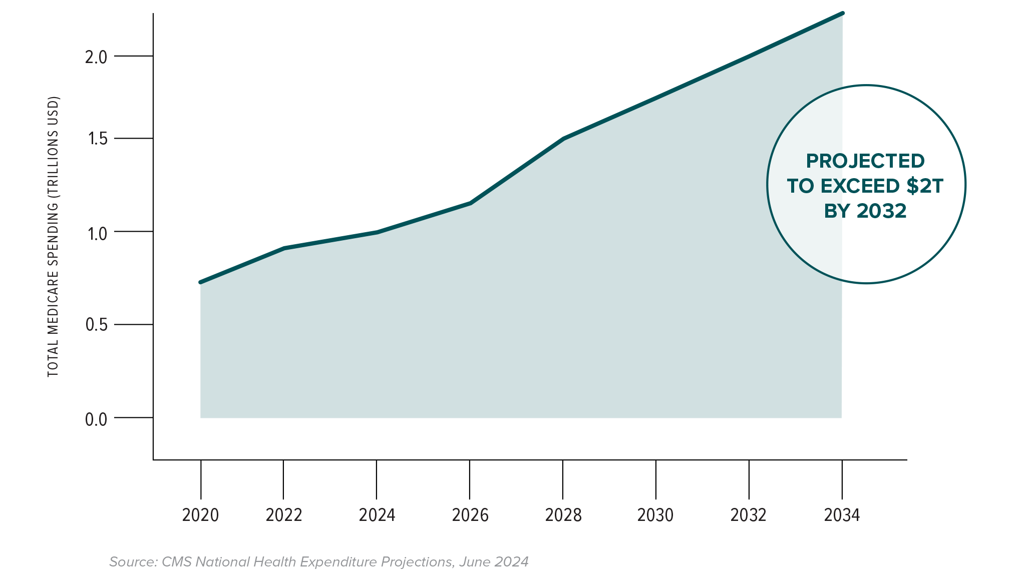 Medicare spending is on an unsustainable trajectory. Spending doubles by 2032 to two trillion dollars!