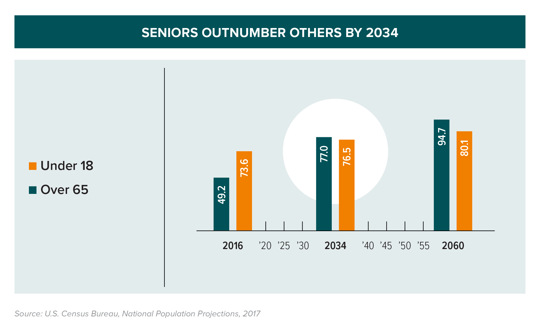 By 2034, older adults outnumber others for the first time in U.S. history.